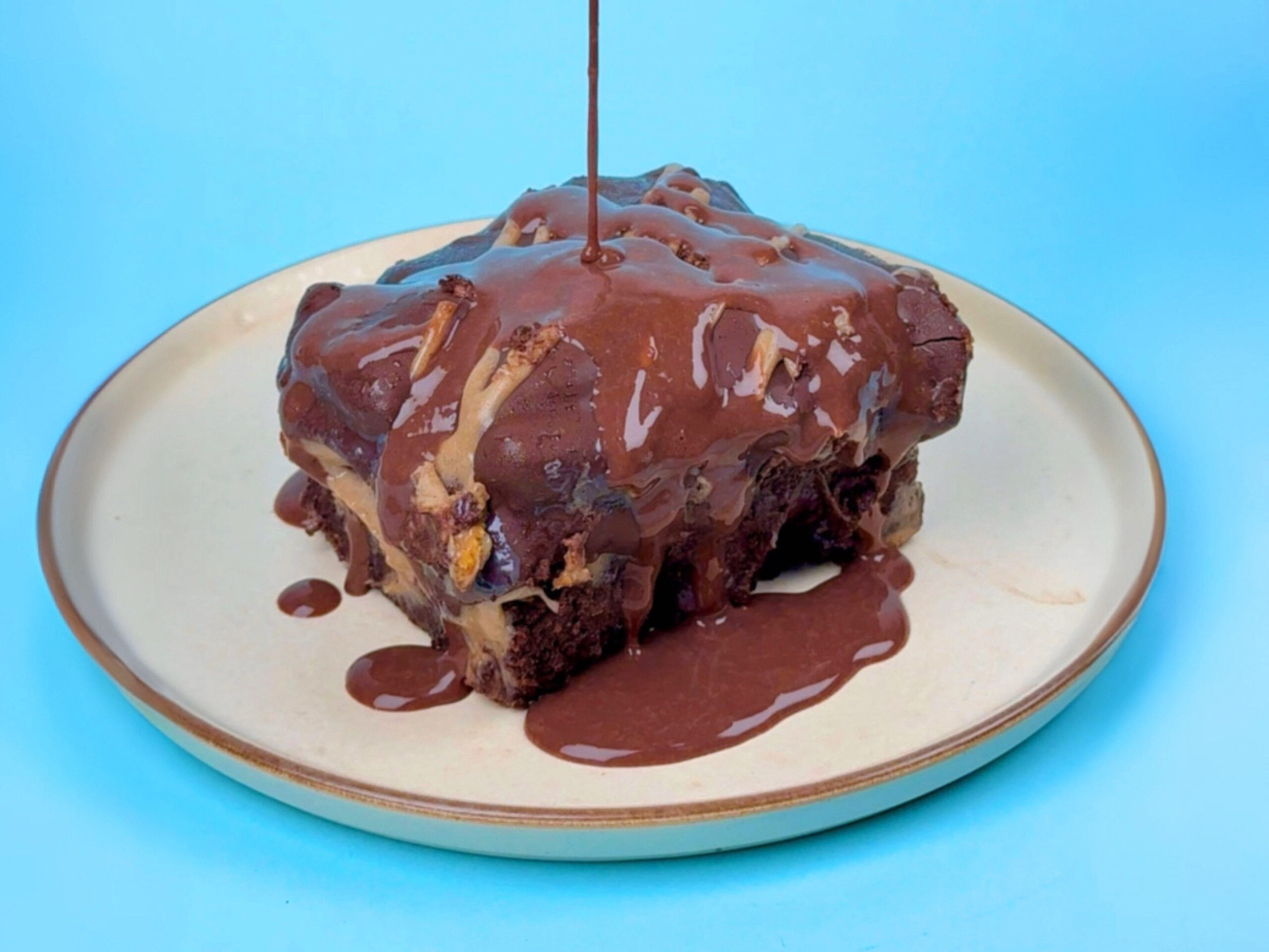 Brownie proteico, con una capa de nutella dulce de leche y crujientes trozos de bi-sheip o cookie proteico cubierto de chocolate bitter sin azucar y decorados con lineas de nutella dulce de leche.
