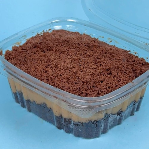 Mousse proteico a base de proteína aislada, cacao, leche descremada light endulzado con eritritol. con capaz de manjar proteico y queque de harina de almendra sabor chocolate.