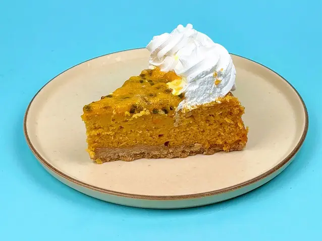 Si te gusta la maracuyá, este pastel es tu mejor opción, delicioso pastel a base de proteína aislada de suero de leche y pulpa de maracuya con una base hecha de harina de Arroz panela y aceite de coco.
