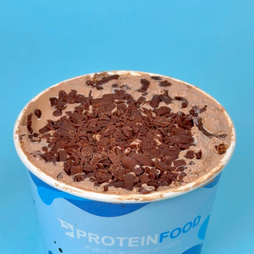 Cuchareable de queque proteico de cacao con capas de manjar sin azúcar y fidge de proteína, decorado con castañas.