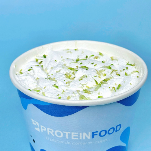 Cuchareable de queque proteico de vainilla con capas de crema proteica de limón sin azúcar y chantilly de coco.