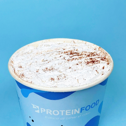 Nuestro tres leches proteico en versión cuchareable con capas de queque húmero de vainilla y proteína, decorado con chantilly de coco proteico.