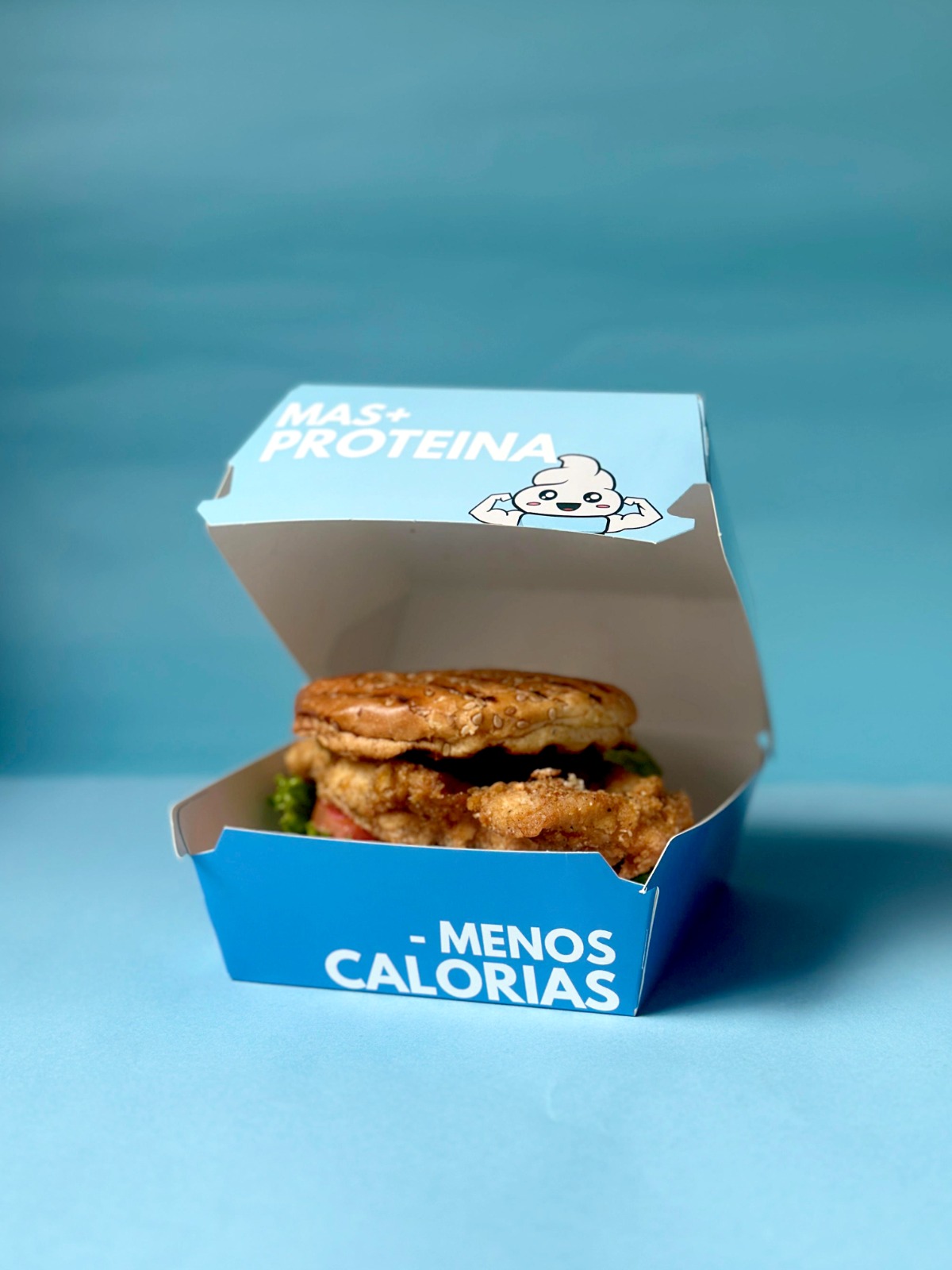 Pan vegano a elección junto con un delicioso pollo crunch; rodajas de tomate; lechuga y cebolla acaramelizada acompañada de una salsa a elección.