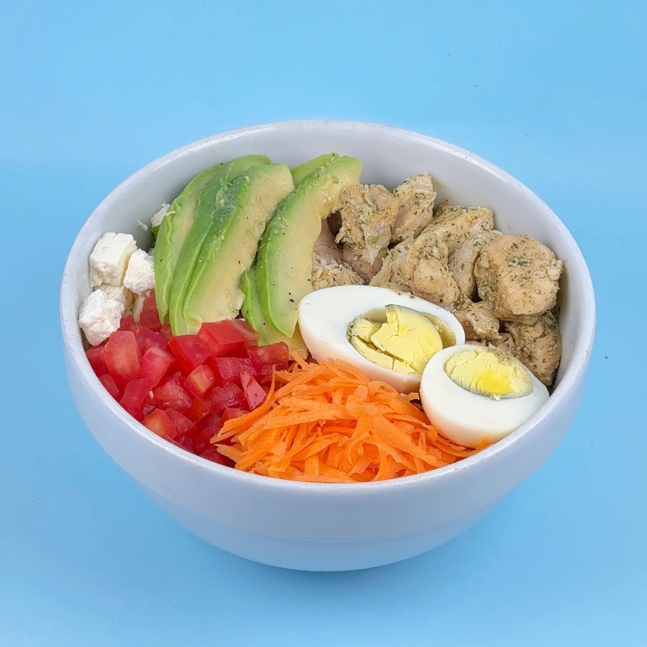 Nuestra ensalada de la casa, hecha a base de lechuga; palta; zanahoria; tomate; queso fresco light; huevo duro; filete de pollo a la plancha acompañada de nuestra salsa de yogurt.