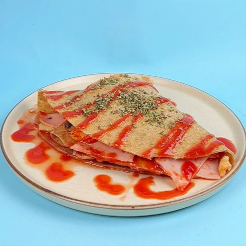 Deliciosa tortilla multigrano, rellena con queso fresco light, salsa pomarola, cebolla blanca, champiñones y jamón de pavo.
